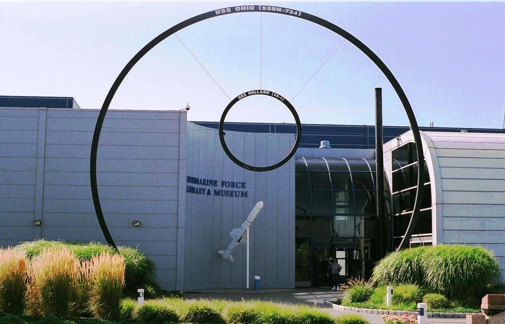 This picture is taken outside of the submarine Force Museum in New London CT. It gives a very visual perspective of how far submarines have grown. The inner ring is the size of the first submarine (Holland) hull, and the outer one is the relative size of the Ohio class submarine’s hull