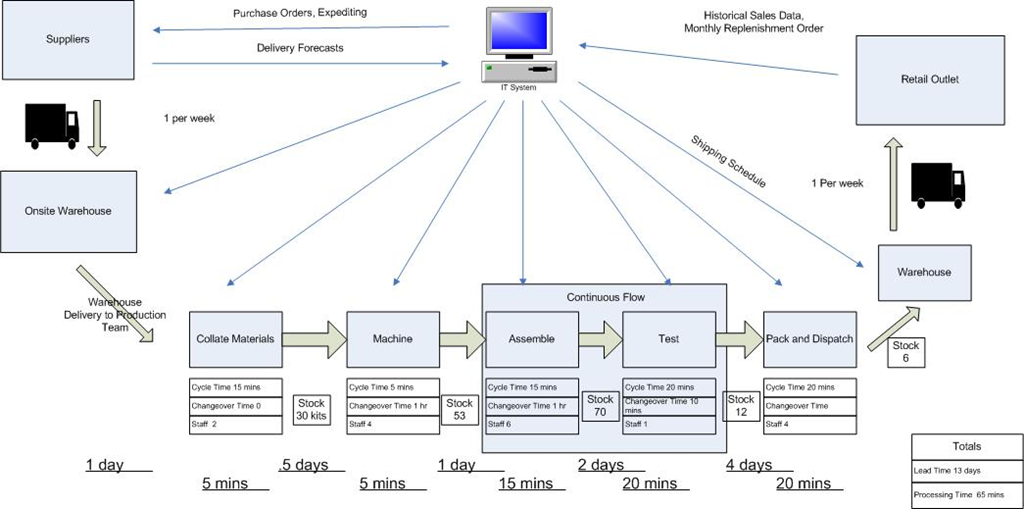 Since flow improvement and waste reduction are pretty important goals in lean, this tool is designed to help you understand where you are at the beginning (Current State Map) and where you would like to go (Future State Map). There are measurements and tools within the model that can quickly identify your pockets of waste, bottlenecks, work flow imbalance, inventory pools (planned and unplanned), and if you really know what to look for you can see where your team has reacted to all of these problems with systems they developed which don’t show up on any plan you have ever seen.