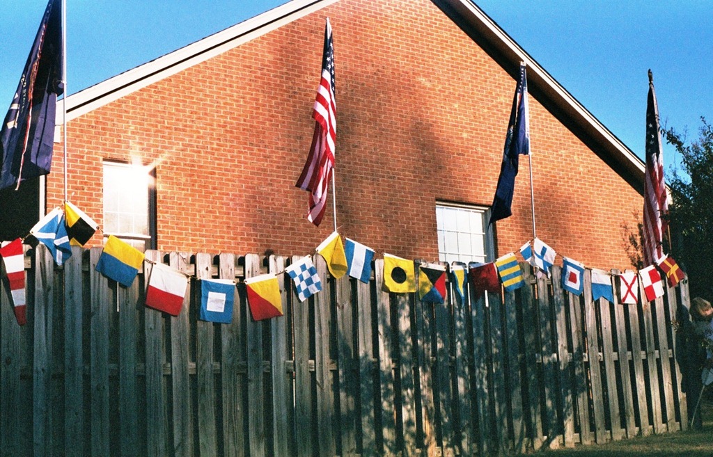 A few years ago we lived in a quiet little community in North Carolina. It was a nice house with a wooden fence all around the back yard. Angus and Rufus were just puppies so the yard was about perfect for them. The wooden fence also offered a great backdrop to one of my best displays of all time. It was a Navy specific holiday and I may have gotten just a little carried away. It took most of the morning to place the flags just so and by noon, it was done.