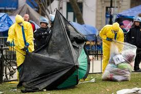 Guarded by police, sanitation workers cleared away most tents and heaps of bedding, palettes, crates, tarpaulins, full-sized mattresses, books, clothes, straw and other debris that had accumulated over the four months of occupation.”