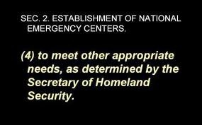 “In the interest of public safety, you are to be temporarily relocated to one of six FEMA relocation facilities where you will be fed, cared for by medical personnel, and secure from any threats. No firearms will be allowed to enter the facilities for everyone’s safety.”
