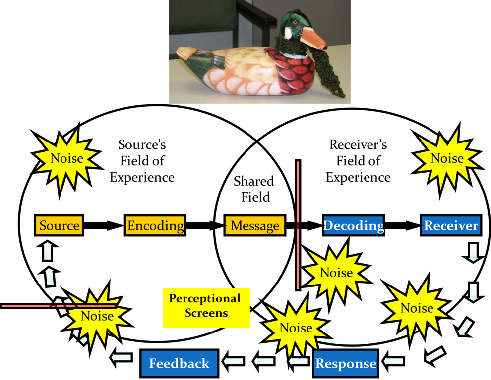 The things it has learned, what it instinctively knows as a duck, experiences that have happened and the environment all make up how the duck knows to send and receive messages. Assuming the receiving duck has a similar field of experience, they probably communicate with ease and little frustration. Life isn’t always that simple though as illustrated in the following diagram: