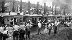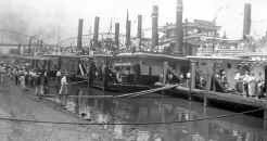 Many of the steamers were loaded with passengers, well dressed in the style of the day (white shoes, white ducks and straw boaters), and all obviously enjoying the festivities. Many of those most prominent in Pittsburgh river affairs at that time were on hand; Capt. J. L. Howder was chairman of the river parade committee and Capt. Bob Eberhart was commander of the fleet.”