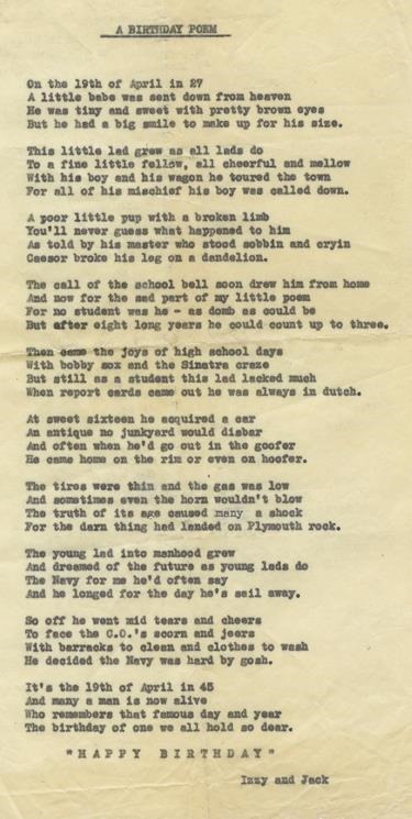 Well, today ends our first week of work and I do mean work. I thought the National Tube used to work me too much but I found different. I got the pen and thanks a lot, it sure writes swell. Boy, just think after next Thursday only four more weeks to go. Boy that will be swell. The Chaplains up here are trying to get 14 days leave instead of 7. If it goes through, it goes in effect May 1. Boy that would be wonderful. There is not much to talk about working in the swimming pool so I can’t think of much to say. Tell everybody I said hello and I would like to call you up but I can’t seem to find the time. That surprise I had, I can’t get yet. It is navy pins for Mom and Ixxy but every time I go to buy them they are sold out, but maybe I can find them someplace. I hope Jack doesn’t have to go. Tell auntie and Nancy I say hello but I can’t find hardly time to write you. Well, I’ll close for now. God be with you all and keep you all safe Mom and Pop.