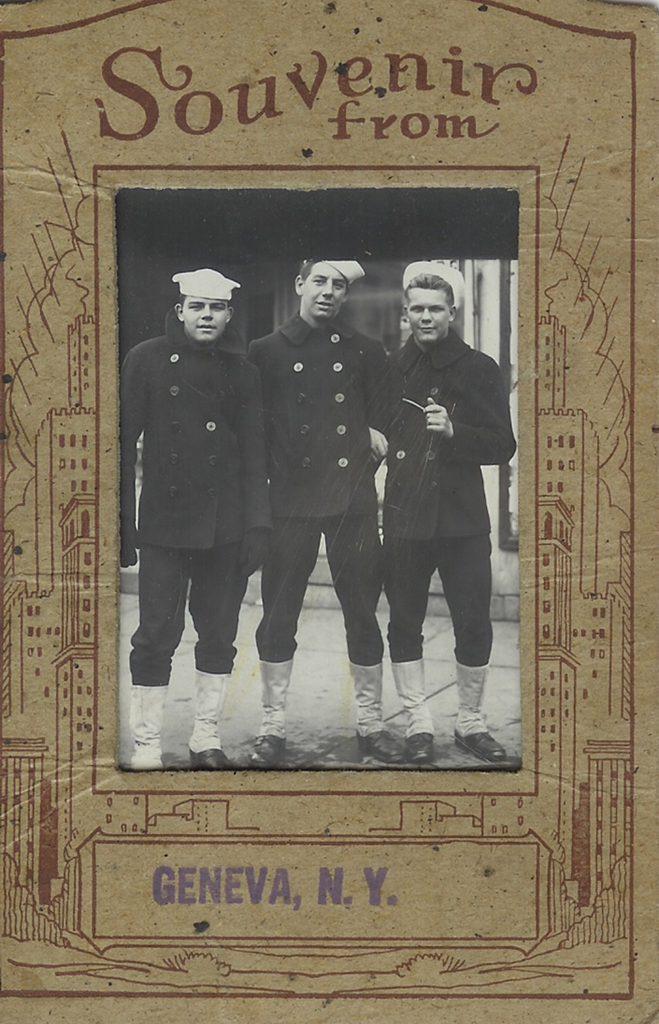 Well, today’s another day. Last night was another night of guard duty. I’m getting used to it now. Well, I’ll be eighteen years old tomorrow, boy I feel older already. It’s a swell morning. The sun is shining like a million dollars. Tuesday we go to Geneva. Boy, big time. My shipmate and I though we saw a prowler last night, and chased him but we were disappointed there wasn’t anybody. We are wearing white hats now. Some of the kids look like salts that have been in the Navy for about twenty years including myself. (Squared white hats you know Pop). Boy are we salty. We have a jazz session every night about nine o’clock and everybody in the unit moons. Boy, what singing. Well, I can’t think of much more to say. I’m glad you both are feeling better and I feel good too so everything s hunky-dory.