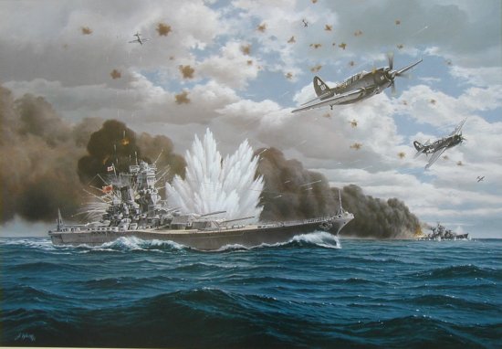 The Yamato was hit by at least eight torpedoes and eight heavy bombs. All the enemy ships were heavily strafed with rockets and machine guns.