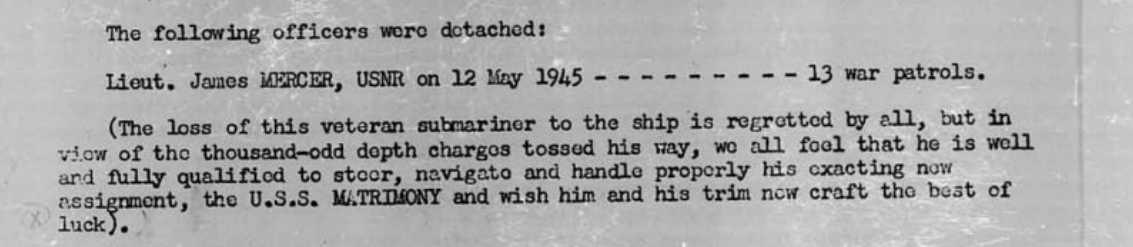 What I like most about these stories is the human face they put on the war’s prosecution. The Blueback’s war patrol records and deck logs have been preserved and I was able to trace the action in the words and sometimes very interesting thoughts of her skipper M.K. Clementson Cdr. USN. one small example came in his final report where he spoke about crewmembers who were departing before the mission began. While reading the original report, I was a bit confused for a few moments about the upcoming re-assignment of Lt. James Mercer who had completed 13 war patrols.