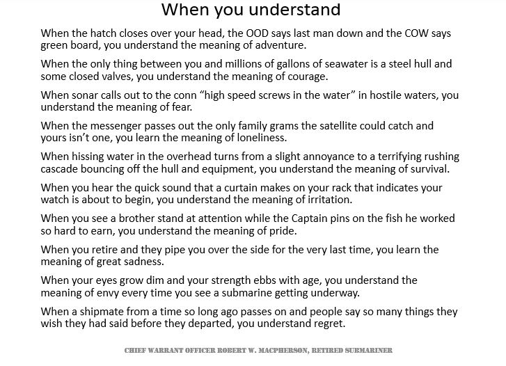 On February 16, 2017, it came to my attention that the story has been cut and pasted with unauthorized alterations and no attribution. I never copyrighted the post or the material but rest assured that it is still my intellectual property. I have shared this freely with the submarine community. All I ask in return is that it not be altered and credit be given where possible.