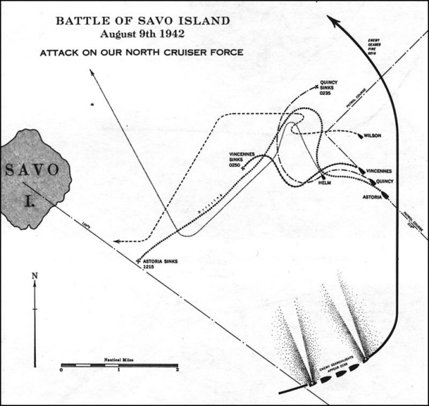 | 0200 | Vincennes starts turn to right. Captain orders 25 knots. | Quincy follows in turn to right. | Astoria turns hard right to clear Quincy’s line of fire. |
