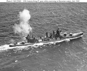 The Astoria was the first of our cruisers to return the enemy’s fire. This was due to the alertness and initiative of the gunnery officer. At the first appearance of the flares, Lt. Comdr. Truesdell had ordered the main battery trained out on the port quarter. At the same time he requested the bridge to sound general quarters. Very shortly afterwards he and the ship’s spotter, Lt. (jg) Carl A. Sander, saw on the port quarter the silhouette of a Japanese cruiser which Lt. Sander identified as of the Nachi class. Then the first searchlight came on. Almost simultaneously, a salvo landed 500 yards short and 200 yards ahead of the Astoria. Lt. Comdr. Truesdell asked permission to fire. A second enemy salvo landed 500 yards short, 100 yards ahead. The next would probably be on in deflection. Receiving no answer from the Bridge, Lt. Comdr. Truesdell himself gave the order to fire, and the main battery sent off a salvo toward the port quarter. All 3 turrets fired, but it is not certain whether 6 or 9 guns participated. The range was 5,500 yards, bearing 240° R. (about 195° T.).