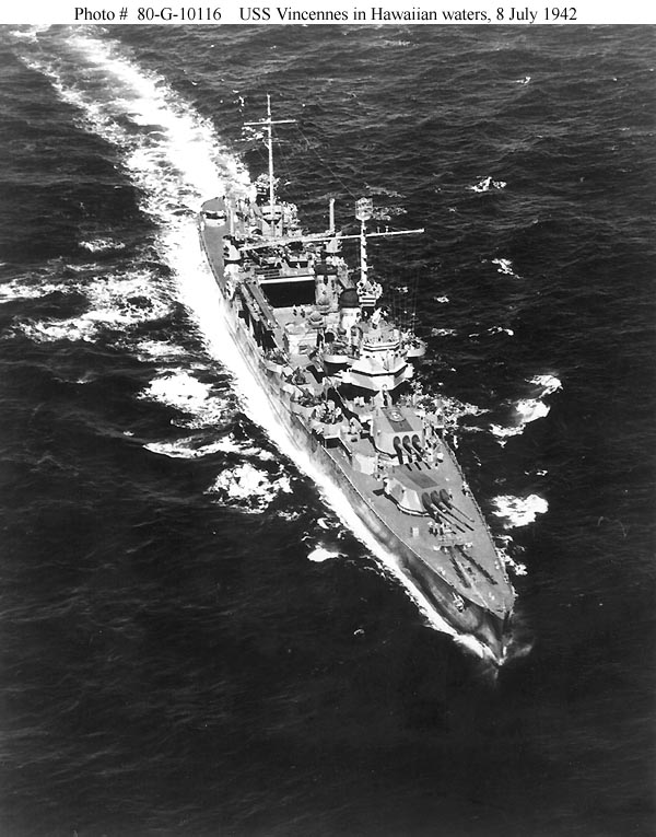 | Vincennes hit on port side by 2 or 3 torpedoes. | Turrets I and II trained to starboard. | Turret III–3 guns. | |