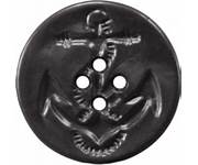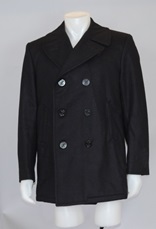 A double-breasted, hip length coat made of dark blue authorized fabric with a convertible collar, a set-in pocket in each forefront, and a single row of four 35-line black plastic anchor buttons down the right front and three on left. Men’s Peacoat buttons to the right.