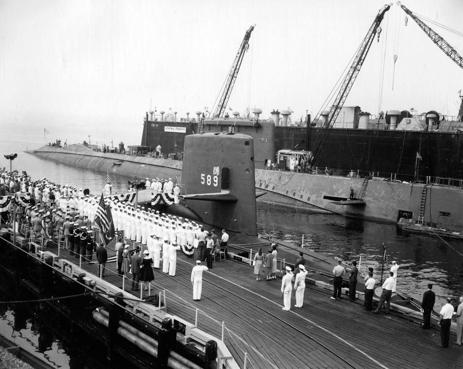 “USS SCORPION was laid down on 20 August 1958 by the Electric Boat Division, General Dynamics Corp., Groton, Conn.; launched on 19 December 1959; sponsored by Mrs. Elizabeth S. Morrison; and commissioned on 29 July 1960, Comdr. Norman B. Bessac in command.