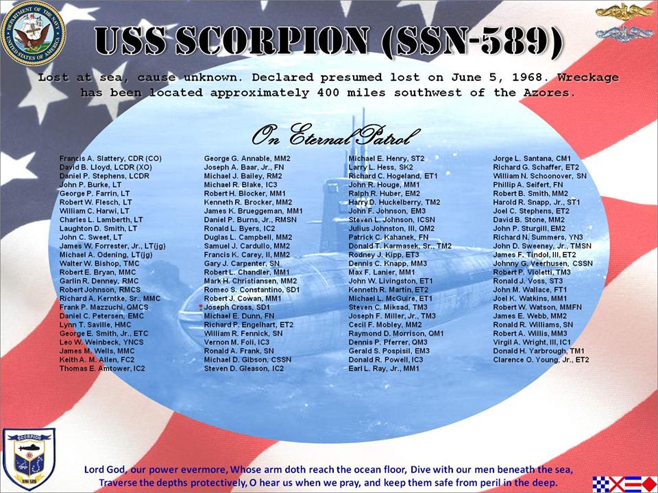 Sadly, some join a special group that is known to the submarine family as “On Eternal Patrol”. The unfortunate members who gain this status gain entry in ways that are the stuff of every submariner’s nightmares. Whether it was fire, flooding, loss of propulsion, an enemy attack, or any of a hundred things that went wrong, the boat often serves as a forever resting place for their physical remains. http://www.oneternalpatrol.com/uss-scorpion-589.htm