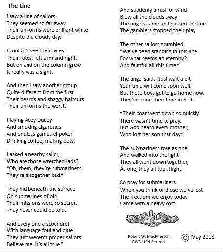 1. Thanks. The anniversary of the loss of the Scorpion was the main inspiration. I thought of all the men I have known over the many years during and after my service that fit this story so well. All of them had hearts of gold even if they were a little tarnished on the outside from all that sea water