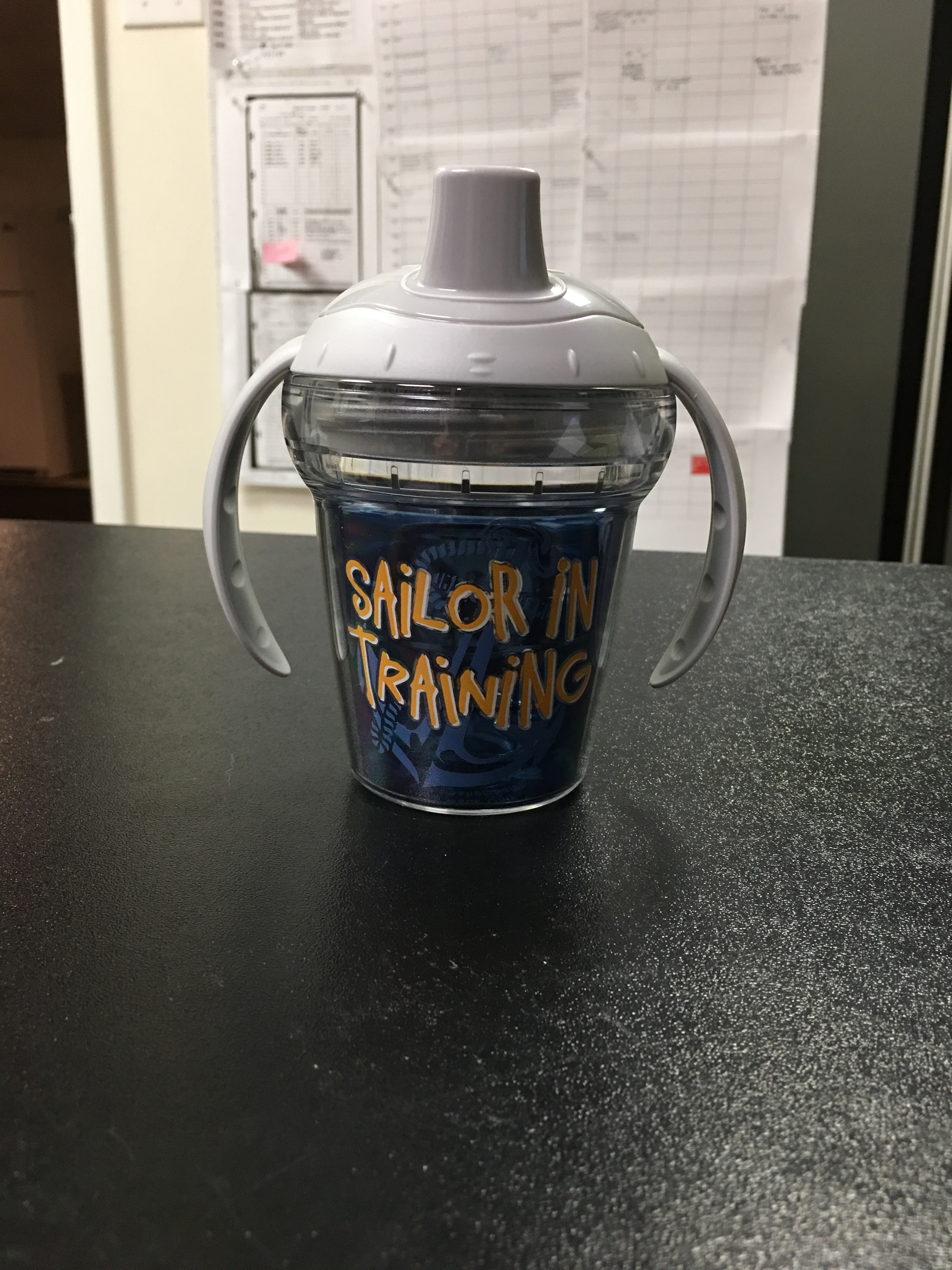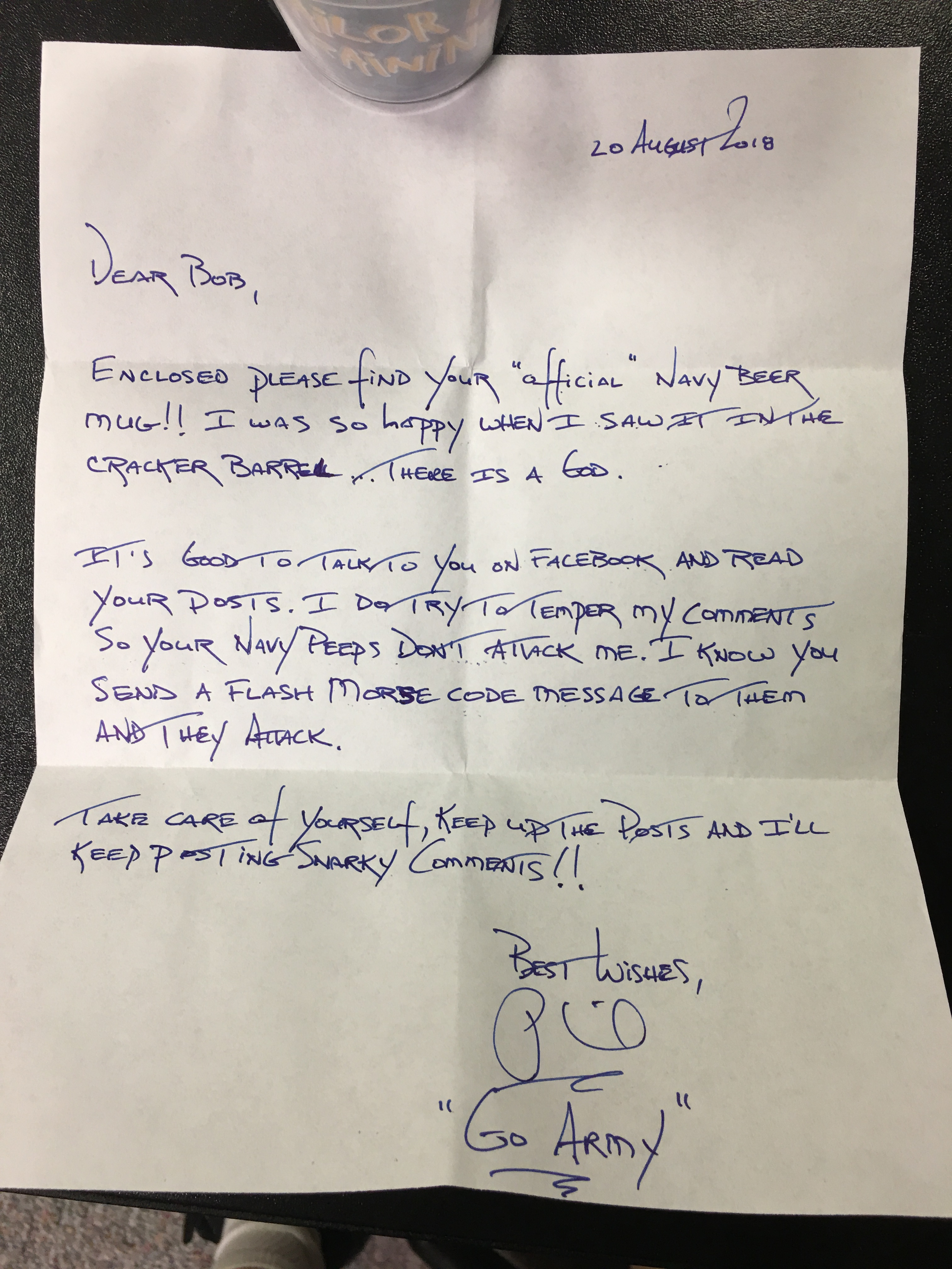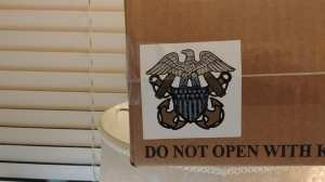 “Chief Bob MacPherson just when I thought I’d trumped you out, I get a package from the Quartermaster General! Even before I can open the package I’m assaulted with some of the stickers on the box…some, not all. Nice tag to the USS Indianapolis. You did owe me the Army Brat sippy cup and I was expecting that. I was also impressed with the document on the “Military Canteen”. Only a ground pounder or Marine would enjoy the article. But as Jerry Seinfeld once said, “…the best joke is one that ends in a totally different way than it starts.” Which is what you did to me with the article…damned Photoshop!! Sadly I’m starting to believe what you tell me about the Navy having lobster, fresh Navy beans and hot/cold running water!! Of course, no communication from you would be complete without a final shot over the bow. We’ll see come December!