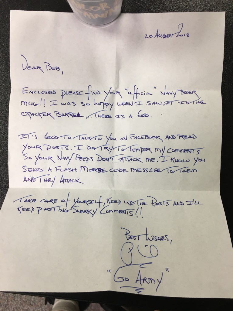 Over the years we have kidded each other endlessly about each other’s branch of the service and the kidding approaches near warfare in the lead up to the Army Navy Game. This year, Phil surprise me with an early gift that he found at a Cracker Barrel store. Cracker Barrel always has a section devoted to Military Pride and Phil had found the perfect gift which he sent to me.