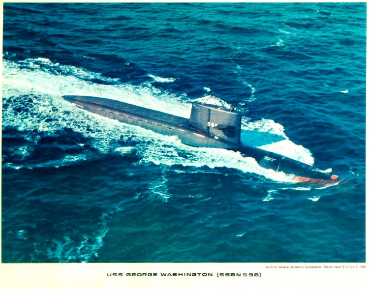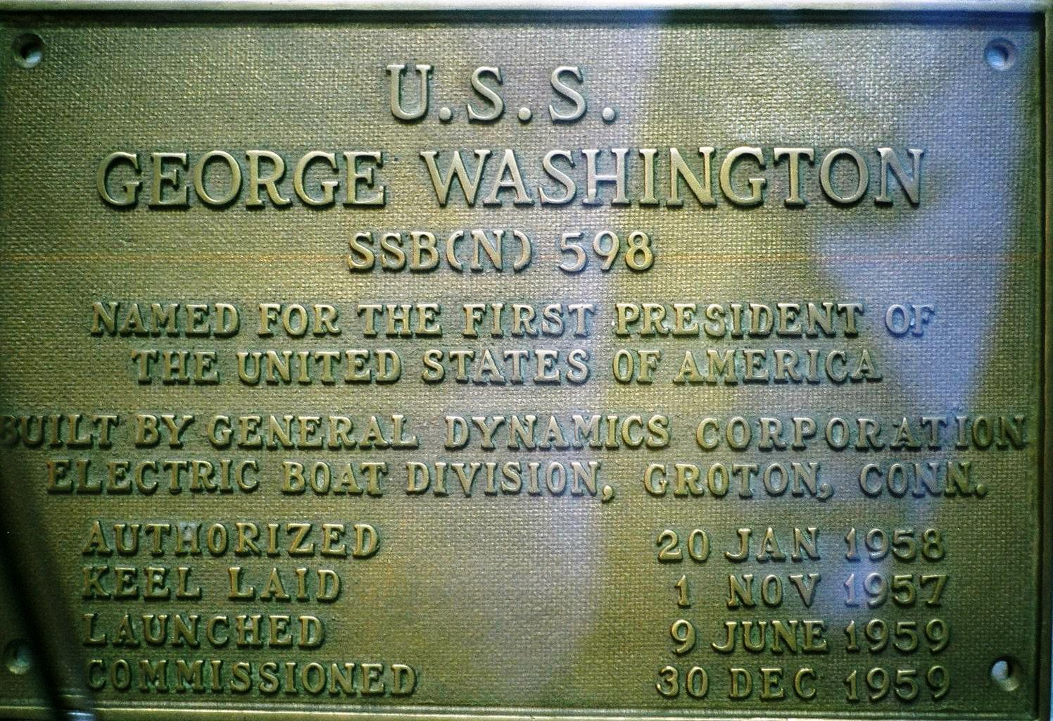 George Washington’s keel was laid down at Electric Boat Division of General Dynamics, Groton, Connecticut on 1 November 1958. The first of her class, she was launched on 9 June 1959 sponsored by Mrs. Ollie Mae Anderson (née Rawlins), wife of US Treasury Secretary Robert B. Anderson, and commissioned on 30 December 1959 as SSBN-598 with Commander James B. Osborn in command of the Blue crew and Commander John L. From, Jr. in command of the Gold crew.