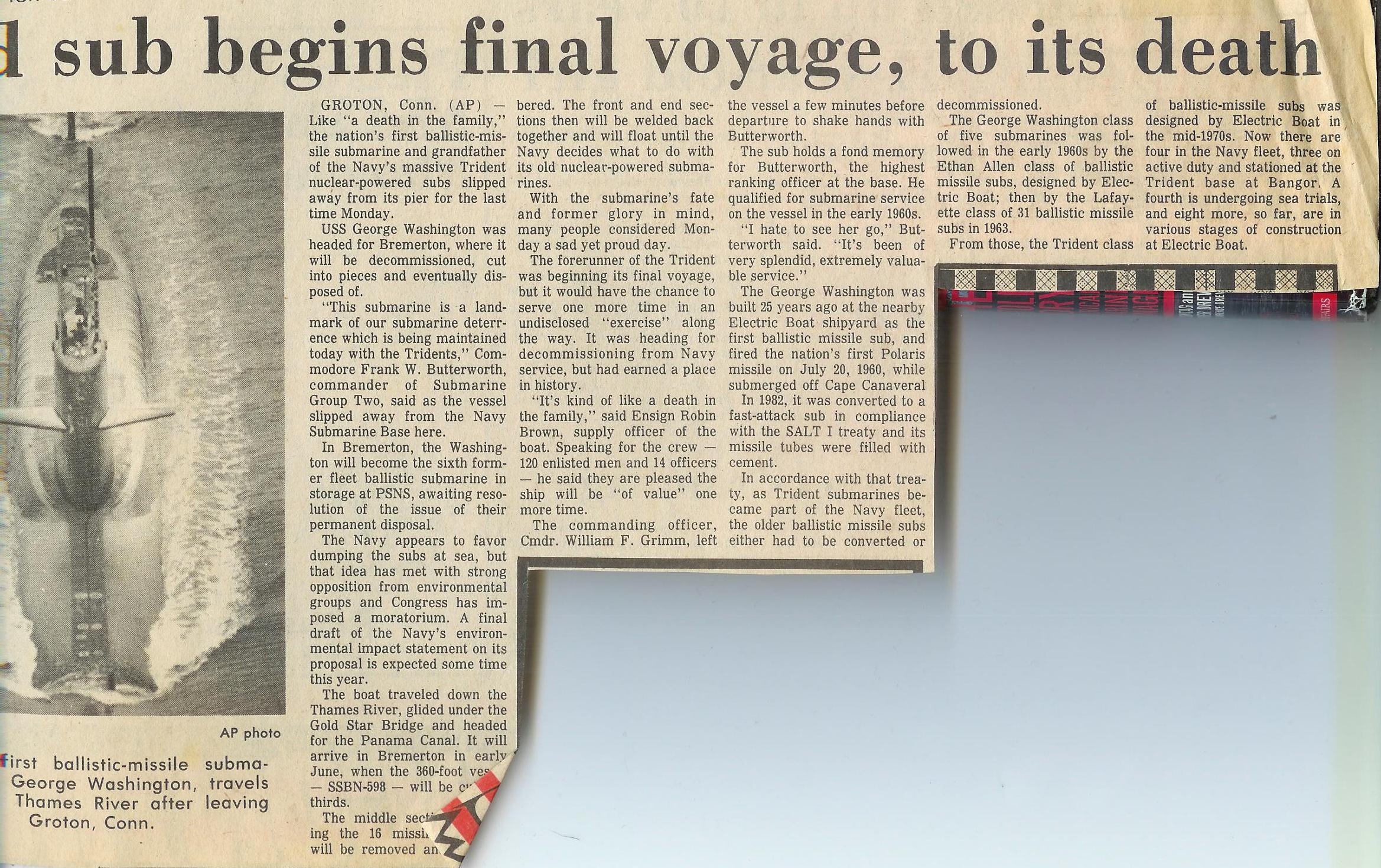 George Washington continued service as an attack submarine (SSN), returning briefly to Pearl Harbor. In 1983, she departed Pearl Harbor for the last time and transited the Panama Canal back to the Atlantic and to New London. George Washington was decommissioned on 24 January 1985, stricken from the Naval Vessel Registry on 30 April 1986, and scheduled for disposal through the Ship-Submarine Recycling Program at Puget Sound Naval Shipyard. Recycling of the ship was completed on 30 September 1998.