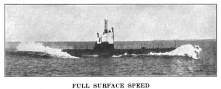 When the submarine runs on the surface it is driven by oil engines with a speed which ranges around 15 knots. When the “sub,” as its crew calls it, dives and runs submerged, it is propelled by electric motors which are fed by storage batteries. At target practice they run submerged at about 8 knots, and one improvement for which all navies are striving is to increase this speed below water.