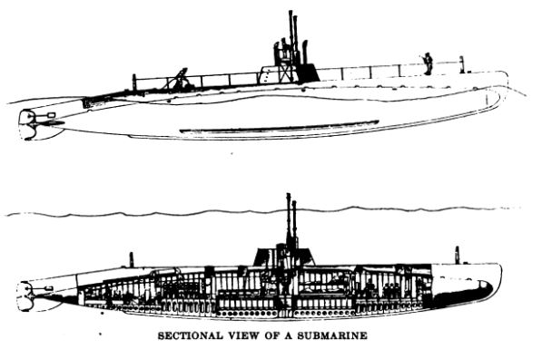 Like the torpedoes that have made the submarine the most dreaded of all sea fighters, the modern submarine is divided into watertight compartments. These are the torpedo, crew, battery, diving, and engine compartments; spare torpedoes are carried in the crew quarters.