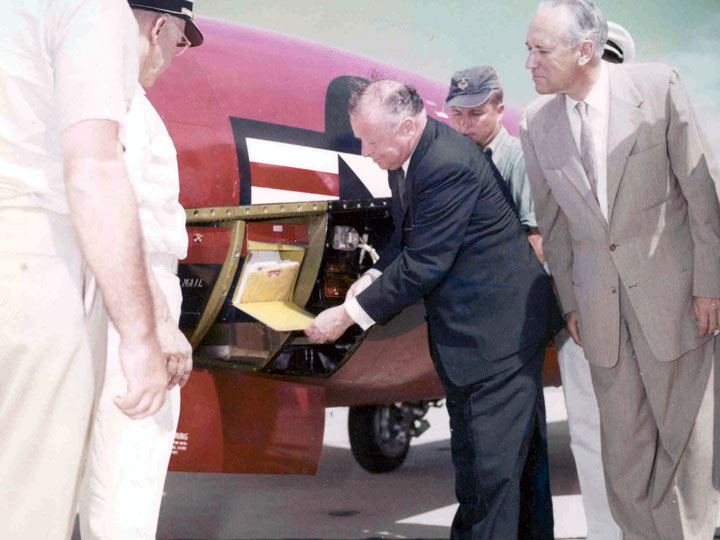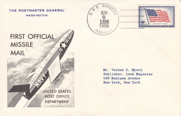 On June 8, 1959, in a move that Postmaster General Arthur A. Summerfield heralded as “of historic significance to the peoples of the entire world,” the Navy submarine USS Barbero fired a guided missile carrying 3,000 letters towards the naval auxiliary air station in Mayport, Florida. Racing along at about 600 miles per hour, the guided missile traveled the more than 100 miles from the deck of the submarine off the coast of Florida to the air station in about 22 minutes. The letters, in special commemorative envelopes, were all from the Postmaster General to leading government officials and prominent citizens with a special interest in the Post Office Department.