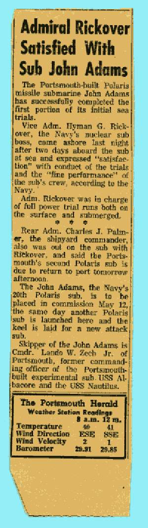 Both names were used, with the Captain of the crew which had possession of the boat using the name John Adams and the off crew captain using the name John Quincy Adams. She was a Lafayette Class Ballistic Missile Submarine: Laid down, 19 May 1961, at Portsmouth Naval Shipyard, Kittery, ME; Launched, 12 January 1963; Commissioned, USS John Adams (SSBN 620), 12 May 1964;