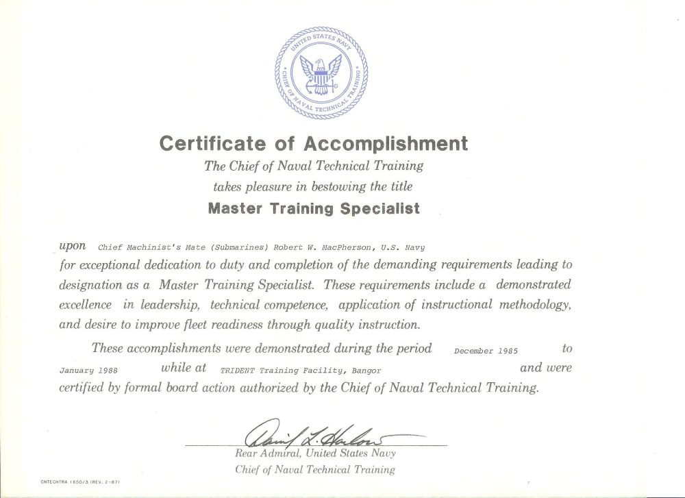 My favorite quote from the Captain of the Trident Training Facility when I was awarded my designation of Master Training Specialist was “Your performance stands as an example for us all. Well Done.”