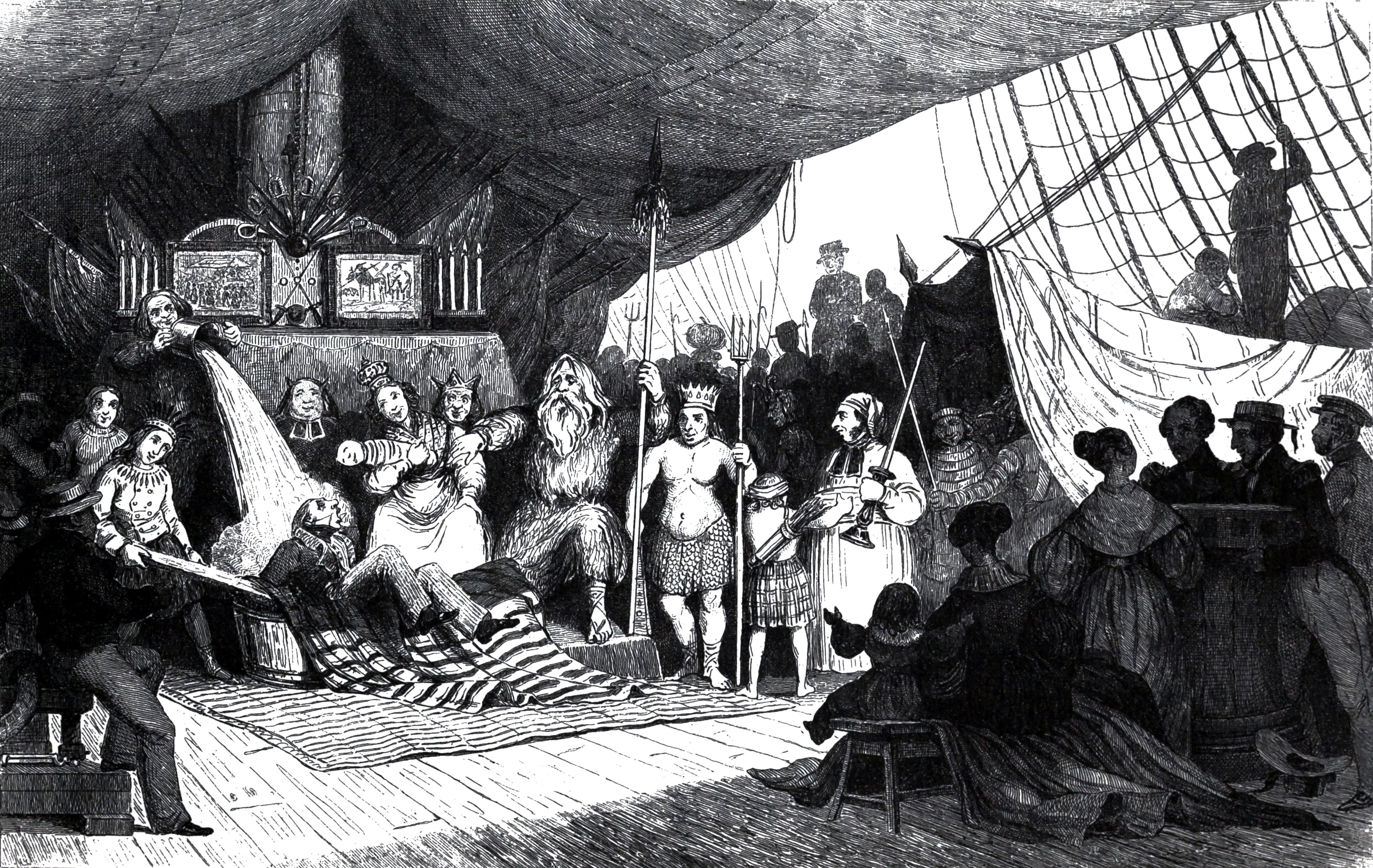 At this time there was a signal given and the entire party went below, not to “splice the main brace,” but, as the modern sailor expresses it, to “brace the main stay.” The little boatswain piped all hands forward, especially the landlubbers, to the forecastle, and there was a grand rush by every “honored shellback” to get the best seat to watch the victims go through the mill as they had years before. There must have been something very interesting down below, as it was a long while before Neptune and his party arrived at the platform to administer the solemn rites.