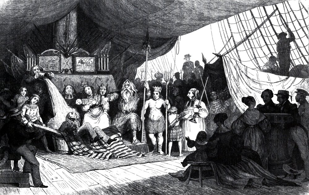 “And be it known by all ye sailors, marines, landlubbers and others who may be honored by his presence, that having been found worthy to be numbered as one of our trusty shellbacks, has been gathered to our fold and duly initiated into the solemn mysteries of the deep. Be it further understood that, by virtue of the power invested in me, I hereby command all my subjects to show due honor and respect to him whenever he may enter our realm. Disobey this order under the penalty of our royal displeasure. Given under our hand and seal this (date). “NEPTUNUS REX, “DAVY JONES, “Ruler of the Raging Main.