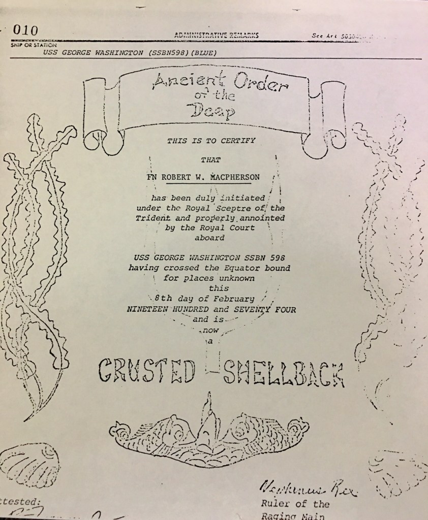 Needless to say, if the President of the United States had to go through the ceremony, a Machinist Mate Fireman would have to take his turn too. The threat at the time was that if you didn’t participate, it would be entered into your service record that you were uninitiated and that would follow you throughout your career.