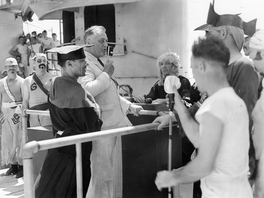 On the open sea, even the leader of a great nation must answer to King Neptune. President Franklin D. Roosevelt was riding the Indy and as the ship crossed the line, he too received a summons to appear before the sea god and pay his respects. The charges brought against him:
