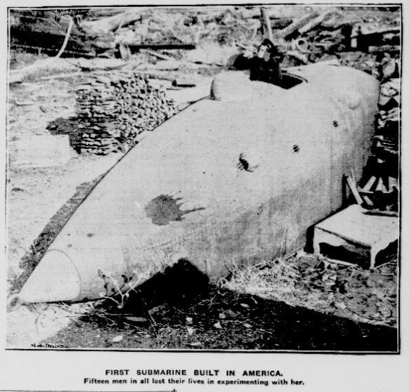 “Among the interesting naval relics on Cob Dock at the Brooklyn Navy Yard which strikingly shows the advance in submarine navigation is what is practically the first submarine built in America. This crude craft, named the Intelligent Whale, is made of wrought iron, 35 feet long and about 8 feet in diameter. Eight men operated her propeller by hand, while another did the steering. Two crews, fifteen men in all, were drowned while experimenting in this primitive boat. After many unsuccessful trails it was finally abandoned by the government. And now rests as a curious relic with a deadly record. “