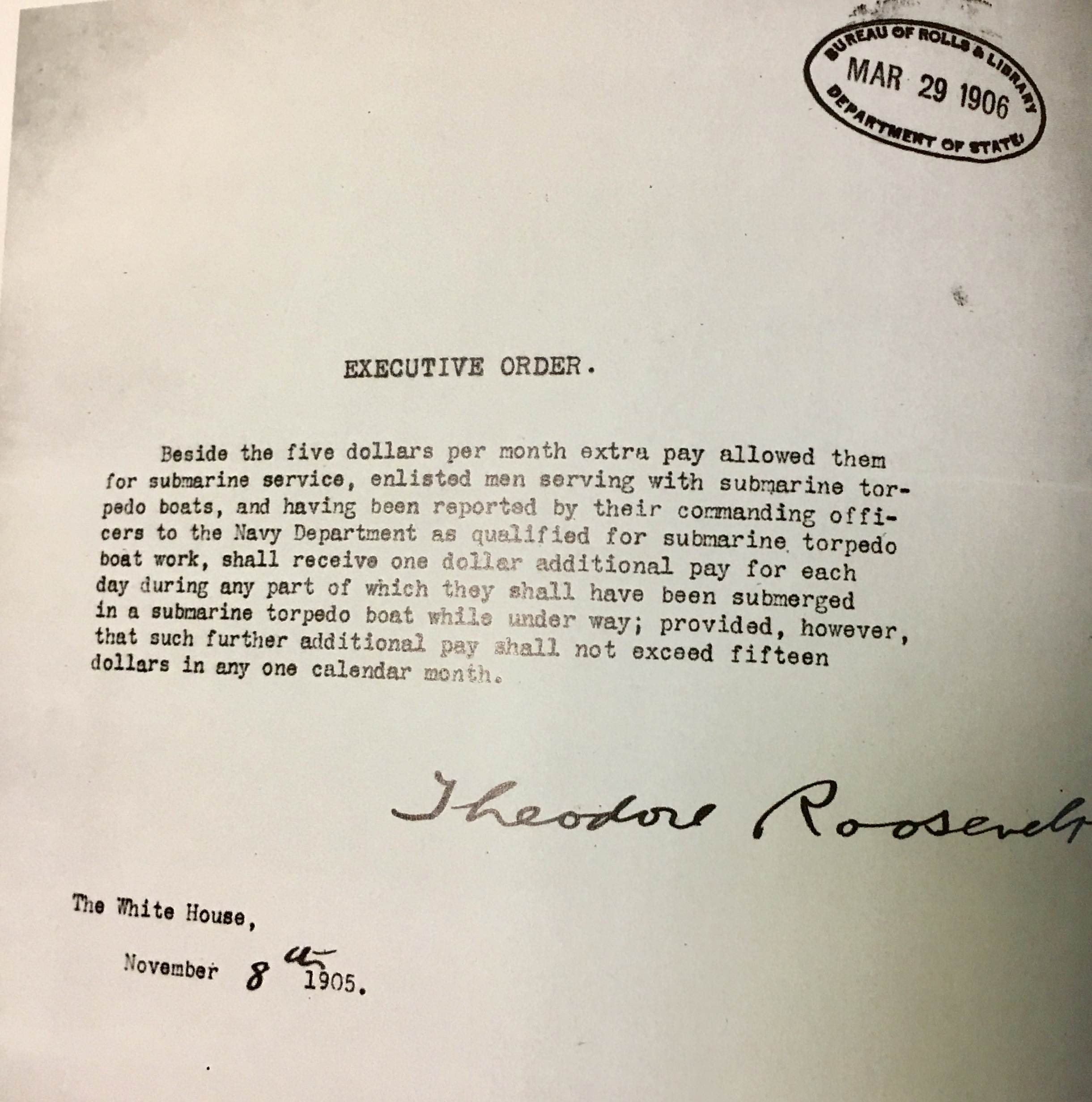 As most American submariners know, Teddy Roosevelt was the first president to take a ride in a submarine. His experience helped to establish the submarine as one of the weapons of the future and had the side effect of rewarding the men submarine pay. I am eternally grateful for both. A lot of liberty ports were made that much more entertaining because of Teddy’s generosity. I wonder if he knew that would happen.