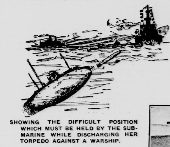 “The estimated speed of the submarine is eight knots, and it is said to be able to run forty to fifty miles submerged. It is limited in active operation to about fifty miles from a base and about twenty-four hours of habitability. Its chief strategic value is centered in its invisibility, being capable of creeping up within a hundred yards or so and delivering a blow to an enemy’s battleship.