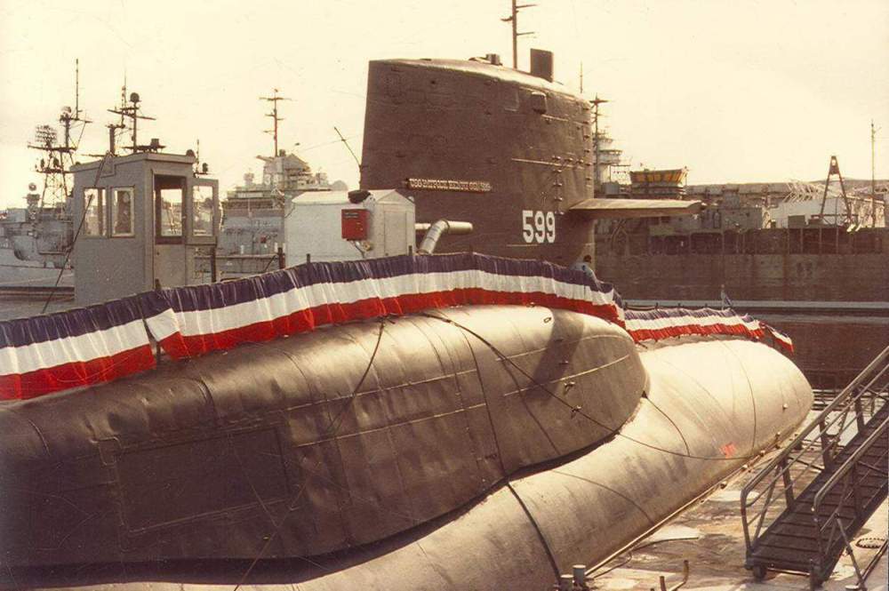 Returning to Groton in 1964, Patrick Henry underwent extensive overhaul, repair, and modifications, allowing her to handle the Polaris “A-3″ missile.   Relocating to the Pacific in the early 1970s, she operated out of Pearl Harbor, Hawaii, patrolling both the Atlantic and Pacific while performing tests on her nuclear capability.   In October 1981, she was reclassified as a nuclear-attack submarine and redesignated SSN-599. Her missile launch capability was disabled to comply with the SALT I treaty. The PATRICK HENRY mainly conducted training exercises in her new role.