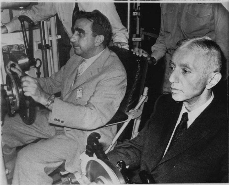AT CONTROLS; Off Groton CT., Admiral Hyman Rickover, right, chief of the Navy’s atomic ship program, and Dr. Edward Teller, noted physicist, were photographed at the controls of the nuclear submarine Patrick Henry (SSBN-599) Saturday, 15 August 1960.