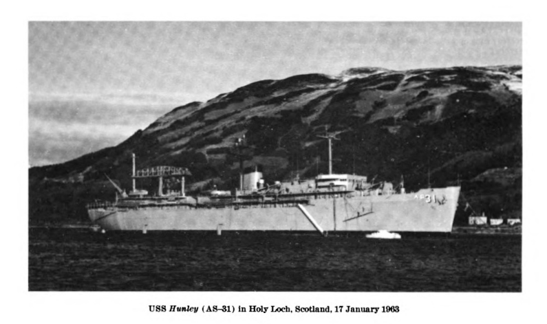 She returned north to Norfolk 28 September for post shakedown alterations until 8 December. She next paid a 3-day visit to New York City to host the Naval Reserve Officers Seminar “New Ships for the Modern Navy.” She stood out of the Norfolk Operating Base 29 December 1962 for Holy Loch, Scotland, arriving 9 January 1963. Almost immediately she began taking the load off Proteus, whom she officially relieved 15 March 1963 as tender to Submarine Squadron 14 at Holy Loch, Scotland. This duty continued until 12 April 1964 when Hunley sailed for conversion that provided capability of handling the new A3 Polaris Missile. She resumed her duties at Holy Loch 15 June 1964.