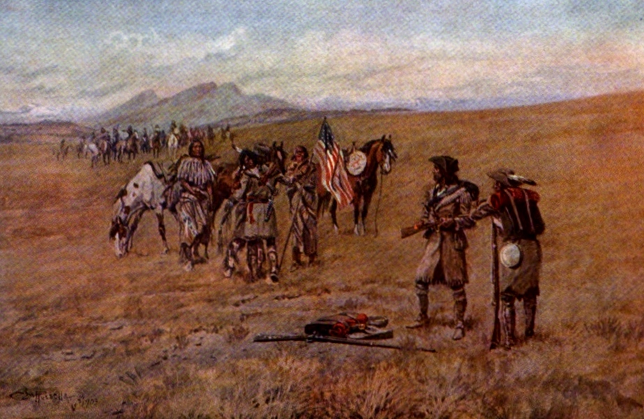 Captain Lewis, with Drewyer and Shields, meeting the Shoshone Indians, August 13, 1805, on the headwaters of the Snake (Lembi) River, in Idaho. From a water color by C.M. Russell. Trail of Lewis and Clark 1804-1904