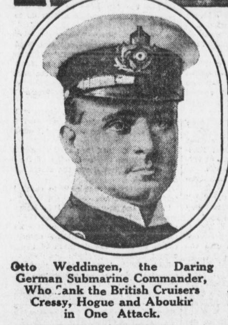 Less than a month after the war had started, a small German submarine commanded by Otto Weddingen, the “Daring German Submarine Commander” sank the British Cruisers Cresay, Hogue and Aboukir in one attack. During a short battle in which he reloaded his torpedoes while submerged and in the thick of the fight, he had managed to gain the advantage on three small Royal Navy cruisers sending them to a watery grave. Along with the ships went nearly 1,400 crewmen in a single day.