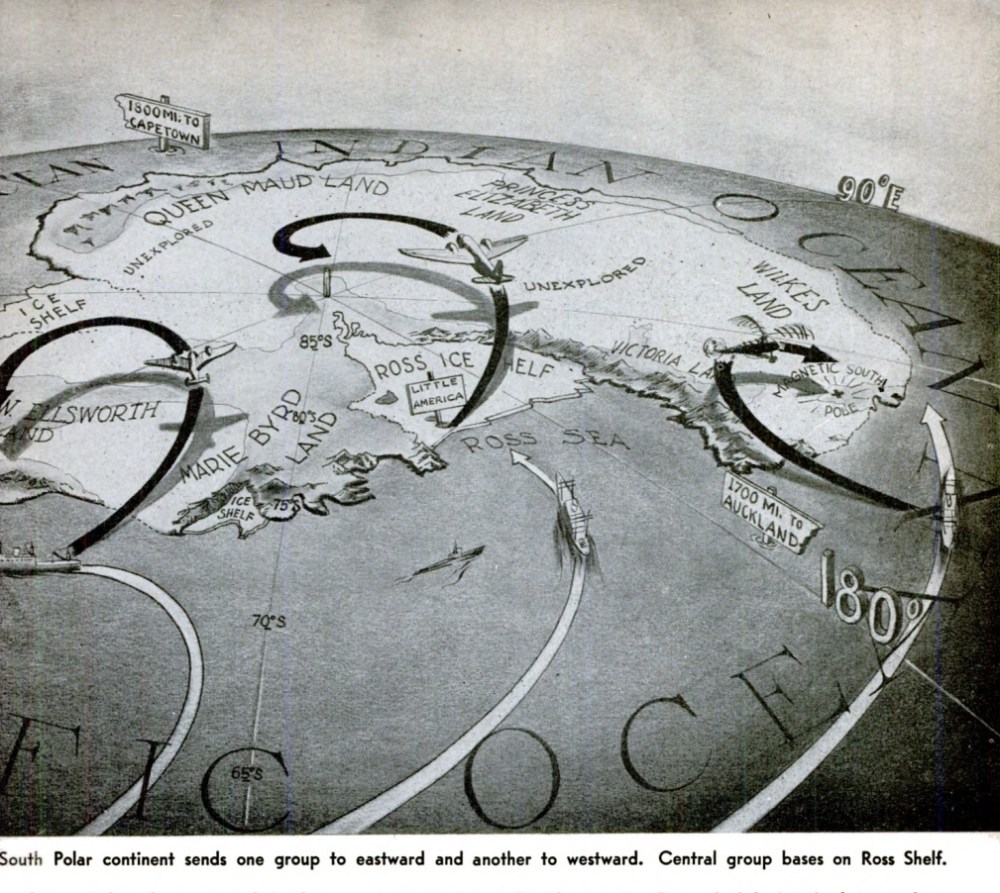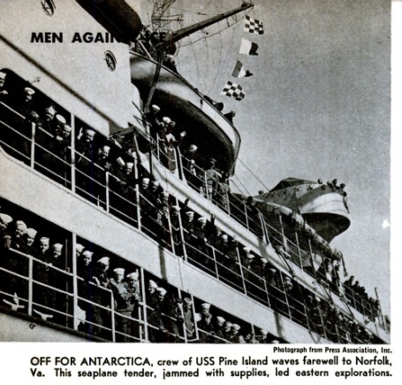 Each of these groups consists of a seaplane tender carrying Martin Mariner patrol planes and helicopters, an oiler and a destroyer. They will continue around the continent, exploring inland by air, as far as the short duration of the operation—and the weather—permit.