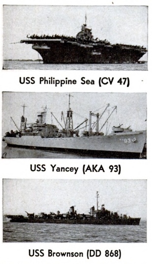 East group — Seaplane tender USS Pine Island, oiler USS Canisteo, and destroyer USS Brownson.