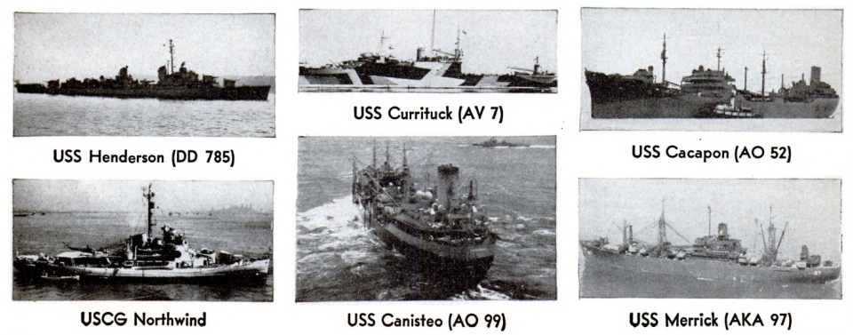 Central group — Flagship and communications headquarters s h i p USS Mount Olympus, Coast Guard ice breaker, USCG Northwind, Navy ice breaker USS Burton Island, cargo ships USS Yamcey and USS Merrick, and submarine USS Sennet.