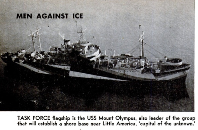 On board the Mount Olympus are 57 members of an underwater demolition unit, who will blast away low ice bordering the permanent shelf ice of the Antarctic continent. These men actually may swim in the icy waters fringing the shelf to plant explosives against the ice. They will be protected by rubber suits sealed against leak age, which will cover their entire bodies. Underneath they will wear woolen underwear and clothing.