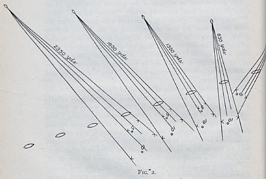 At night submarines on the surface will use the same recognition signals used by all surface vessels of the fleet. During daylight operations the problem of recognition is much more difficult. At comparatively short ranges, 3000 yards and less, the submarines submerged can recognize a friendly vessel by her silhouette, or at shorter ranges by certain flag or shape signals shown from specific parts of the surface vessel. If surface vessels are fitted with submarine signal apparatus, code recognition signals may be sent, using the bell within the limited distances mentioned in this discussion. By properly screening a submarine bell it is quite possible to send the sound waves out on a line of bearing, or at least within a very small arc. However, in the absence of the submarine bell the battleships or surface vessels must rely on their flag or shape signals to make themselves known as friends. The submarine has only two methods of recognition signals at her disposal, one, sounding code words or letters on her bell, and the other, carrying a certain shaped flag or pennant on her periscope. It would seem that the submarine bell methods would be more efficient at greater distances than the other method, but it has the disadvantage of warning friend and foe alike of the presence of submarines. From a submarine officer’s point of view it would seem far better to trust to the judgment of the commanding officer of the submarine to recognize friendly vessels, which he could most certainly do from a silhouette diagram at comparatively long ranges. After recognizing a friend a submarine may rise to the surface and exhibit surface recognition signals, if such are necessary. This method, however, might endanger the submarine before she is recognized as a friend. The submarine officer desirous of getting within easy torpedo range would be very loath to disclose his bearing to a probable enemy by sounding his bell.