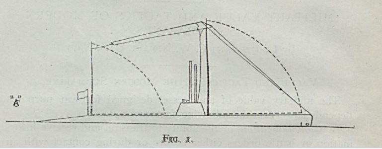 Submarine craft on the surface within sight of each other have the same ability as other surface craft to communicate freely, using for this purpose the various systems of day and night signaling used in surface craft. For long distance signaling the submarine or submersible has a radio outfit capable of operating at distances up to fifty (50) miles. As the range of the radio outfit depends on the height of the aerial, the larger submarine boats can easily obtain a greater range by using higher masts. The present practice consists in carrying the portable aerial on two masts which fold down on the deck just before submerging. The sending and receiving apparatus is permanently installed in the forward end of the submarine, as far as possible from the noise and vibration of the propelling machinery. Sketch “A.”