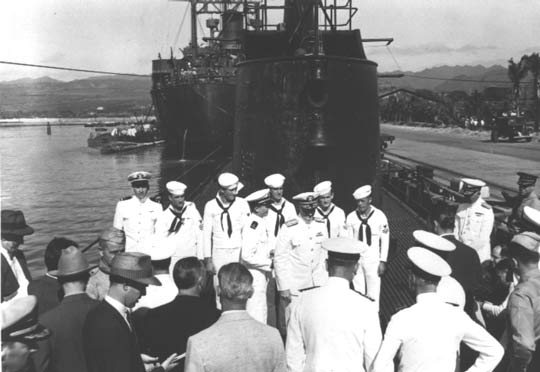 For years afterward I continued to serve in submarines afloat. Then, as naval duties took me away from the submarines, I followed their steady development with undiminished interest. When I assumed Command of the Pacific Fleet, I hoisted my flag in USS GRAYLING (SS-209). When detached, after V-J Day which owed so much to the valor, skill and dedicated service of submariners, I lowered my flag from the gallantly battle-tested USS MENHADEN (SS-377). While Chief of Naval Operations, with imaginative leaders like my Deputy, Vice Admiral Forrest Sherman, Vice Admiral Charles A. Lockwood, Naval Inspector General, who brilliantly commanded our Pacific submarine operations during much of World War II, and Vice Admiral Earle Mills, Chief of Bureau of Ships, I was happy to initiate the development of nuclear power afloat.