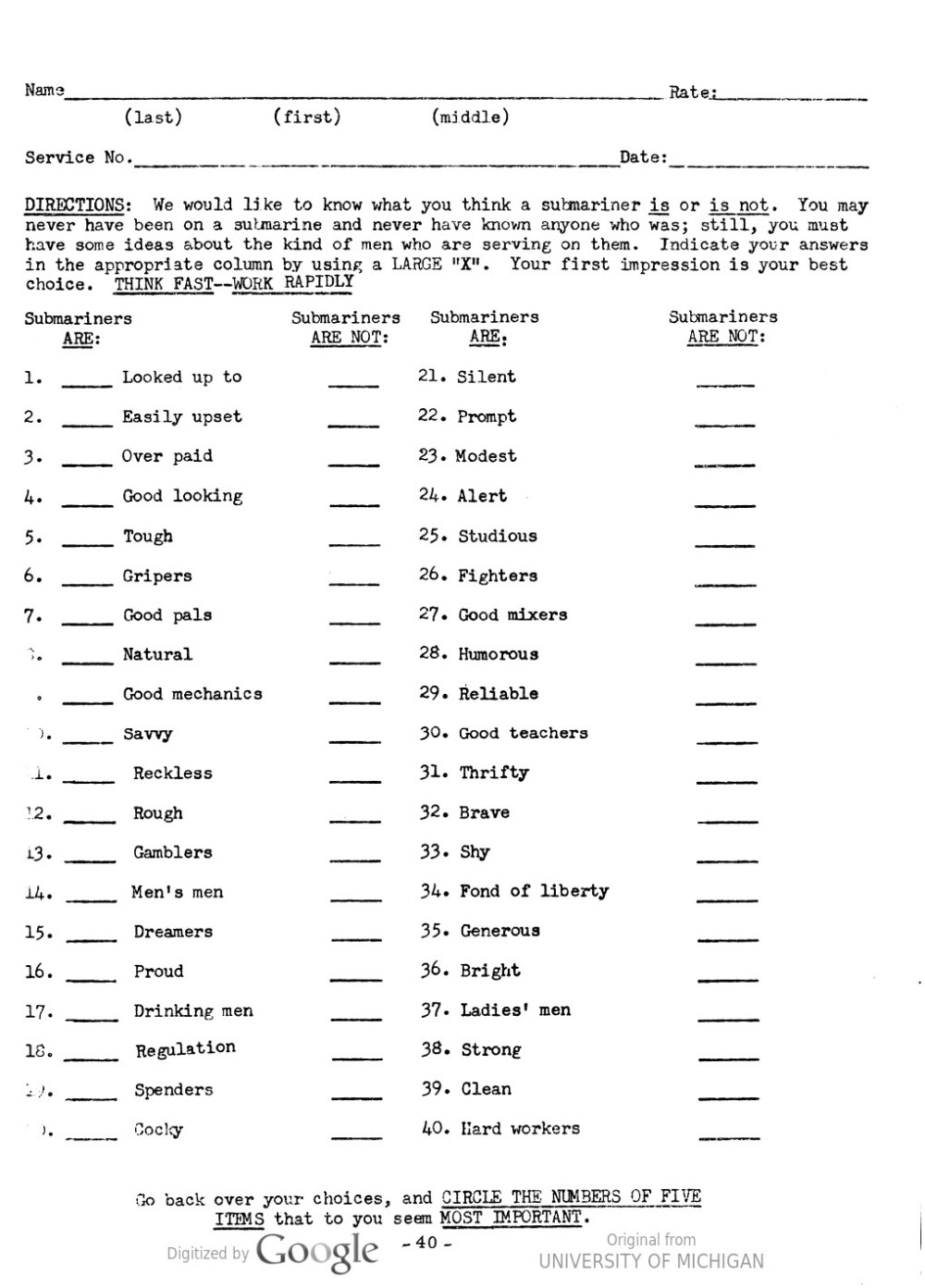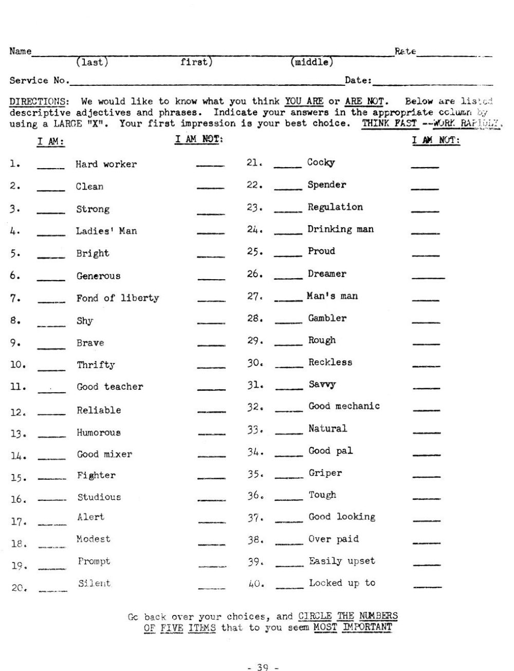 Below are the two documents that were originally included in the 1951 study. Cut and paste them into a separate document and complete both parts as directed on the instruction sheet. Then circle the top five answers to both tests. As stated in the directions, the first part is you answering for yourself. The second set of questions are how you view submariners.