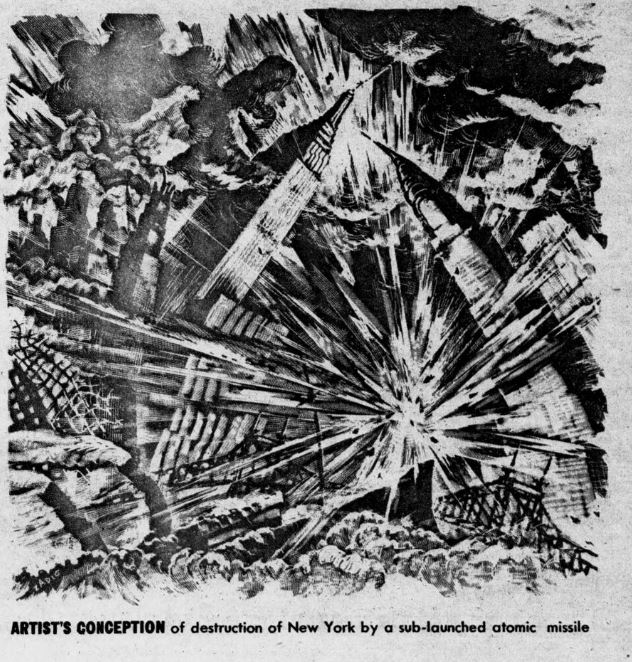 Today, in the terrible event of war, enemy submarines could not only cut our supply lines to our troops and allies abroad, but could blast our coast with guided missiles from far out at sea. If and when our enemies master the H-bomb, this can mean the utter annihilation of such cities as New York, Boston, San Francisco and Los Angeles.