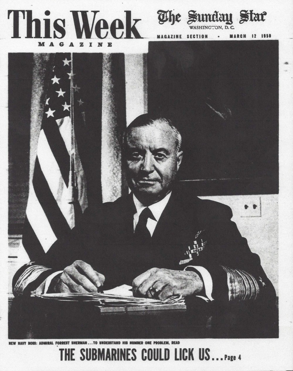 The man on the cover, Admiral Forrest P. Sherman, our new Navy chief, is more important to your safety than you probably realize. His big job these days is to find a way to lick the submarine menace.